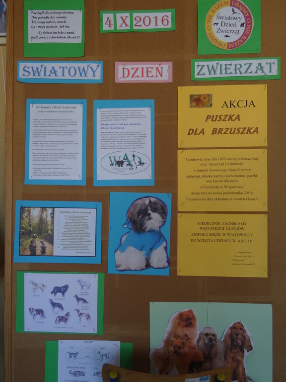 4 października 2016 roku w Szkole Podstawowej w Wiązownicy obchodziliśmy Światowy Dzień Zwierząt. Tego dnia ruszyła też akcja pod hasłem „Puszka dla głodnego brzuszka”, do której włączyli się uczniowie młodszych klas. Dzięki ich zapałowi i miłości do zwierząt udało się zgromadzić około 35 kg karmy, którą przekazano do schroniska dla zwierząt w Wiązownicy. Potwierdzenie odbioru i podziękowanie od Dyrektora Zakładu Gospodarki Komunalnej w Wiązownicy zamieszczamy poniżej.
