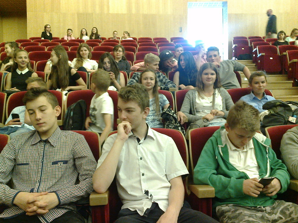Konferansjerka poprosiła młodzież na widowni o zachowanie ciszy, aby egzamin mógł przebiegać bez żadnych zakłóceń. Młodzież obietnicy dotrzymała, na sali panowała wzorowa cisza.
