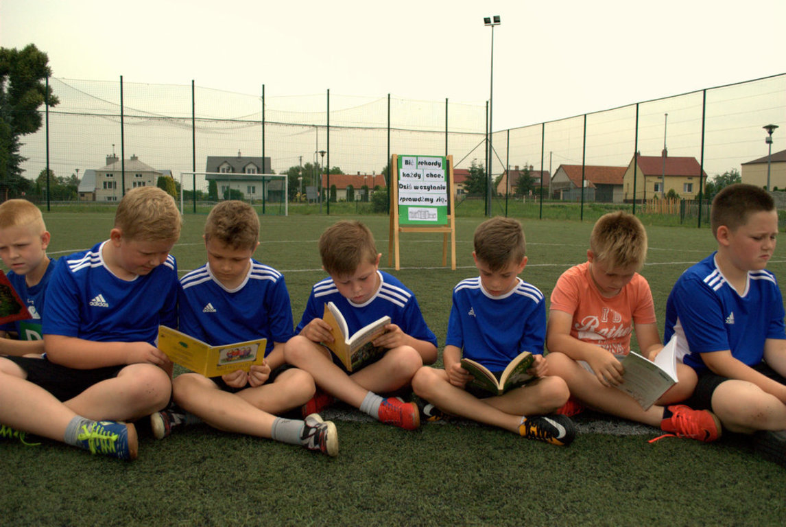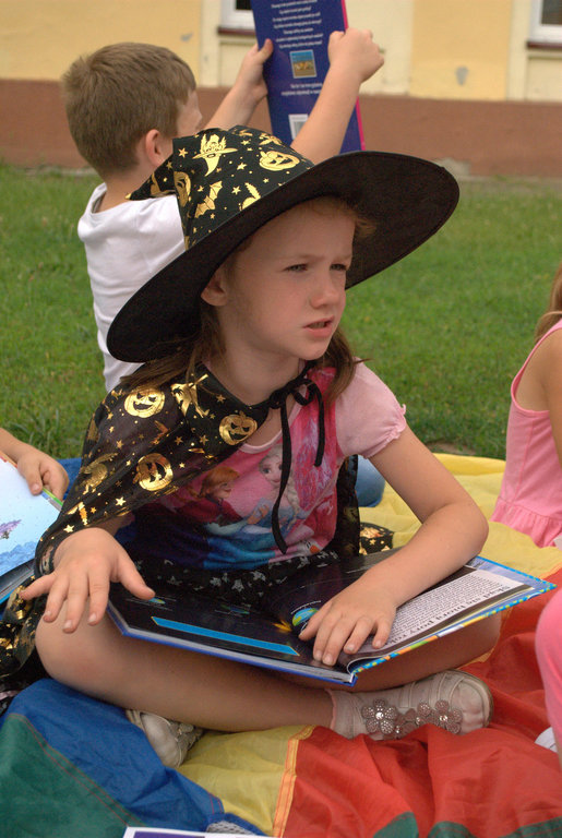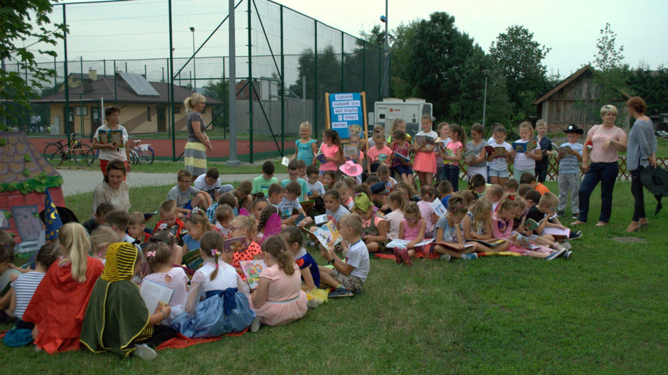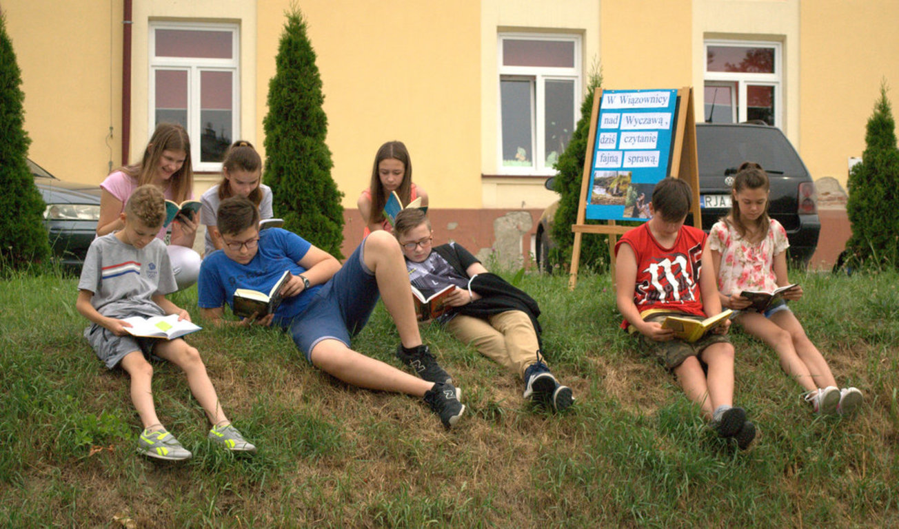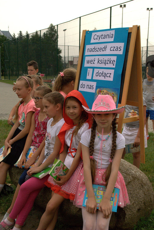 i swobodnej atmosferze czytały wybrane fragmenty utworów. Najmłodsi czytelnicy, ubrani w barwne stroje, wcielili się w bohaterów bajek, starsi zaś układali „żywe napisy”, tj. W – jak Wiązownica oraz liczbę 100, nawiązującą do stulecia niepodległości Polski. Na tę okoliczność wypożyczono uczniom nowe książki zakupione w ramach Narodowego Programu Rozwoju Czytelnictwa. Widok nowej, atrakcyjnej książki, zapewne spowoduje, że wielu czytelników zechce wypożyczyć ją na wakacje, by nie tylko „zabić wakacyjną nudę”, ale odkryć radość z czytania.