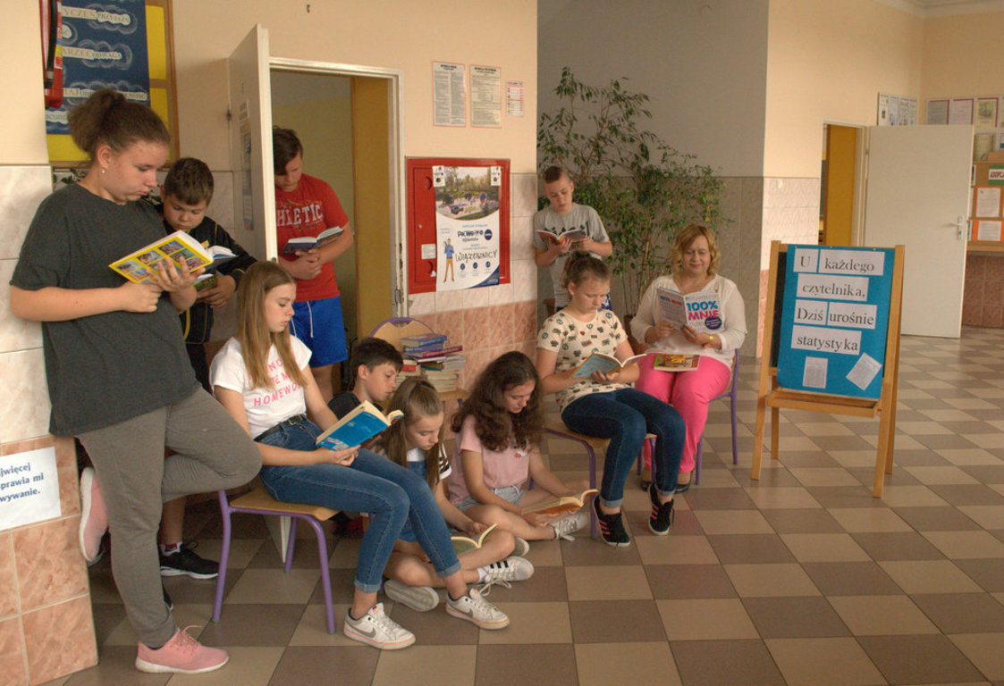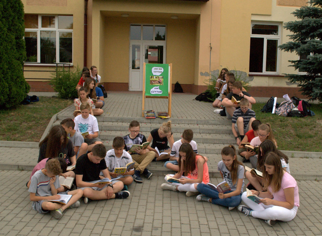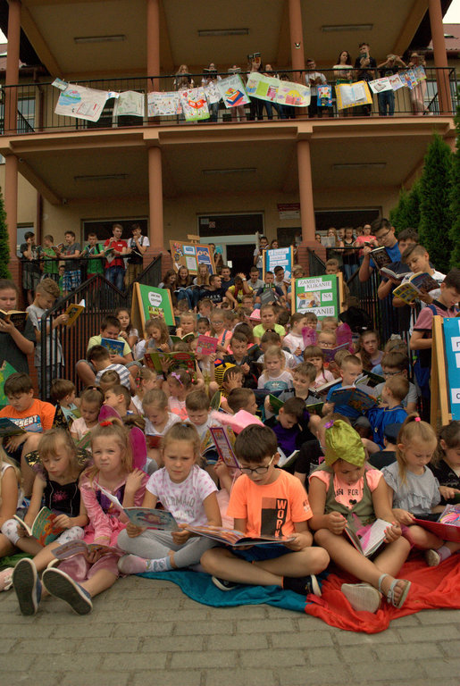 Do akcji przystąpiliśmy po raz drugi. Uczniowie, przygotowując imprezę czytelniczą wykazali się dużą kreatywnością. Pod okiem szkolnych bibliotekarek oraz wychowawców klas wybrali miejsca do czytania, ułożyli hasła promujące akcję i czytanie. Zgodnie z propozycją organizatorów i pomysłami uczniów wszyscy zebrali się na dziedzińcu szkoły. Każdy uczeń trzymał w ręku własną lub wypożyczoną w szkolnej bibliotece książkę, którą na początku wszyscy otworzyli na 100. lub dowolnej stronie /jeżeli książka była o mniejszej liczbie stron/ i przeczytali głośnym chórem pierwsze zdanie z wybranej strony. Po takim wstępie grupy udały się do wybranych miejsc, gdzie w miłej