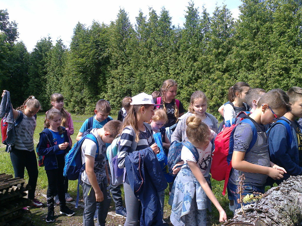 Pani leśnik Marta Szmul na zajęciach terenowych opowiadała i pokazywała życie lasu, jego gatunki roślin i zwierząt, uprawy leśne. Wspominała też o środowiskach sąsiadujących z lasem, jakimi są pole i łąka.