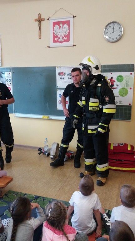 Uczniowie dowiedzieli się, że p raca strażaka jest ciężka i niebezpieczna. Poznali zadania i obowiązki członków OSP oraz dowiedzieli się,jakie predyspozycje powinien posiadać kandydat na strażaka. Strażacy zademonstrowali zasady udzielania pierwszej pomocy w nagłych wypadkach oraz przypomnieli numery alarmowe, które każdy powinien znać. Uczniowie mieli okazję zobaczyć, jak wygląda strój strażaka gotowego do akcji, obejrzeli również sprzęt ratowniczo - gaśniczy wykorzystywany do ratowania ludzkiego życia.