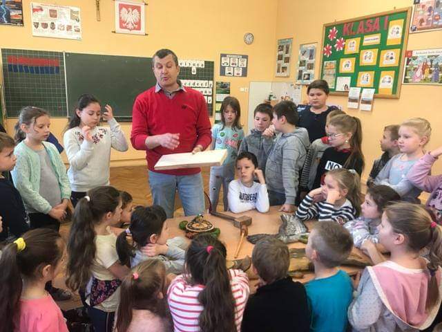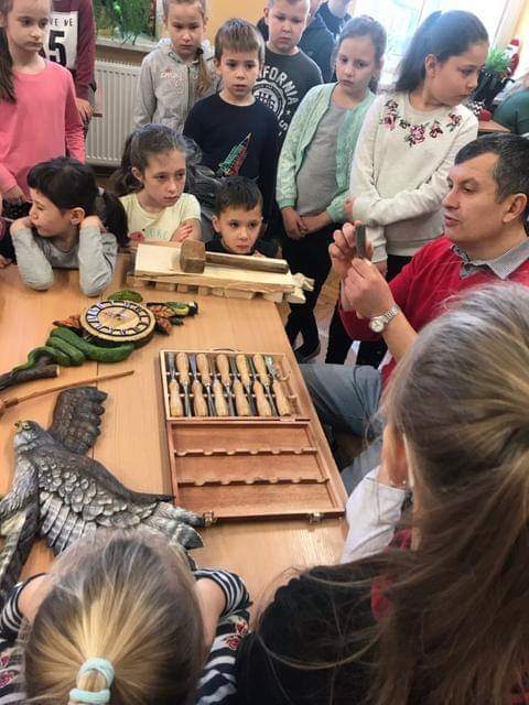 5 grudnia uczniowie klas I- III spotkali się z artystą ludowym. Pan Wacław Januszkiewicz jest rzeźbiarzem z zamiłowania i uprawia ten rodzaj sztuki od wielu lat. Dzieci z zainteresowaniem wysłuchały wspaniałej opowieści gościa o odkryciu własnej pasji i o samym tworzeniu w drewnie. Miały okazję zobaczyć pracę artysty od podstaw, a więc wybór odpowiedniego drewna, sztukę rozplanowania rzeźby, którą chce się wykonać oraz tworzenie dzieła. Obejrzały różnego rodzaju dłuta i rylce, wykorzystywane podczas pracy oraz rzeźby i płaskorzeźby autorstwa pana Wacława.