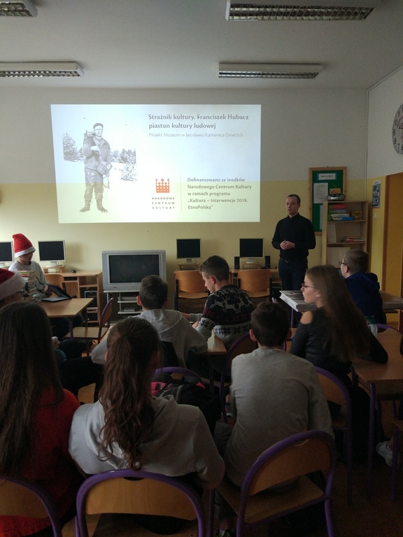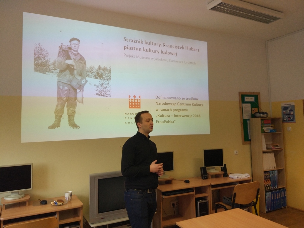 6 grudnia 2018 r. w naszej szkole odbyło się spotkanie z pracownikiem Muzeum w Jarosławiu Kamienica Orsettich panem Piotrem Borutą, który zaprezentował książkę pt. „Strażnik kultury. Franciszek Hubacz”. Książka ta to rodzaj albumu ze zdjęciami, który zostały uzupełniony komentarzami opracowanymi przez Zofię Tabin, Jan Kucę i Tomasza Ożoga. Pracownicy muzeum zamieścili w książce zdjęcia nieżyjącego już mieszkańca Mołodycza pana Franciszka Hubacza, prawdopodobnie jedynego posiadacza w tej miejscowości aparatu fotograficznego. Dzięki swej pasji upamiętnił on szereg scen z życia wsi po II wojnie światowej do lat 70. XX wieku. Prezentację książki uzupełnił pokaz multimedialny, który wzbudził wielkie zainteresowanie uczniów, gdyż na zdjęciach rozpoznawali swoich dziadków, babcie i innych krewnych. Młodzież dzięki fotografiom poznała, jak żyli i wyglądali ich przodkowie.