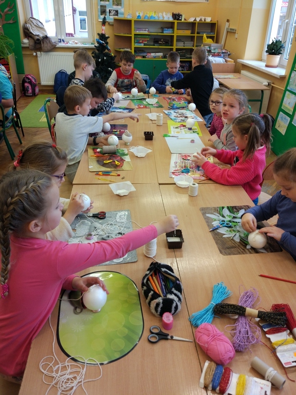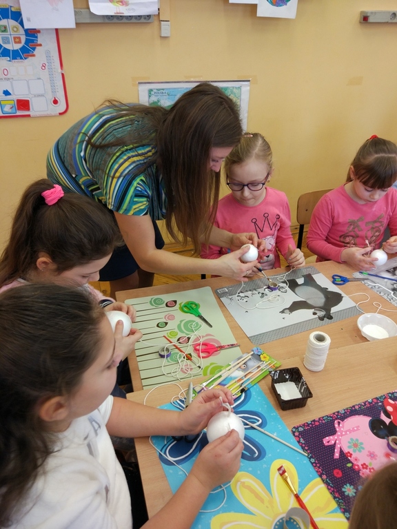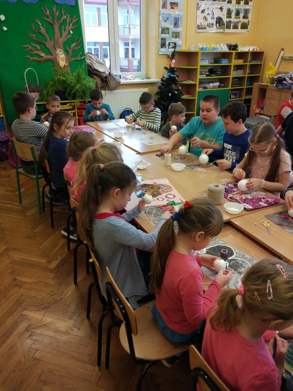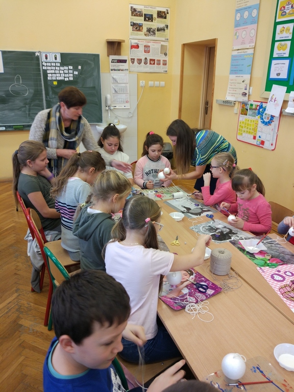 Pani Joasia pochwaliła się swoją pasją, którą jest wykonywanie różnych ozdób i dekoracji świątecznych. Zaprezentowała ciekawe ozdoby bożonarodzeniowe, które wykonała różnymi technikami, używając wielu materiałów. Uczniowie pod kierunkiem Pani Joanny tworzylibombki na styropianowych kulach. Wszyscy pracowali z wielkim zaangażowaniem, oklejając swoje prace kolorowymi sznurkami. Najciekawszym etapem pracy było ozdabianie cekinami, kokardkami i różnymi ciekawymi błyskotkami. Bombki nabrały blasku i cieszyły oko małych wykonawców.