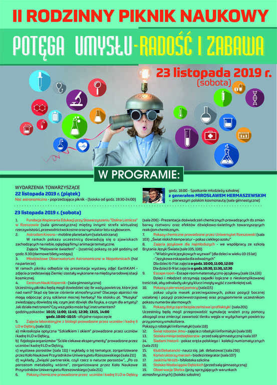 Stowarzyszenie „Uwierz w siebie” i II LO im. ks. Jana Twardowskiego w Dębicy serdecznie zapraszają 23 listopada 2019 r. (sobota) na to wspaniałe wydarzenie, które odbędzie się w budynku II LO im. ks. Jana Twardowskiego w Dębicy przy ul. Sportowej 24 od godz. 9.00 do godz. 15.00. Będzie można zobaczyć ponad 20 fantastycznych pokazów i prezentacji przybliżających zagadnienia naukowe w ciekawy i interaktywny sposób.