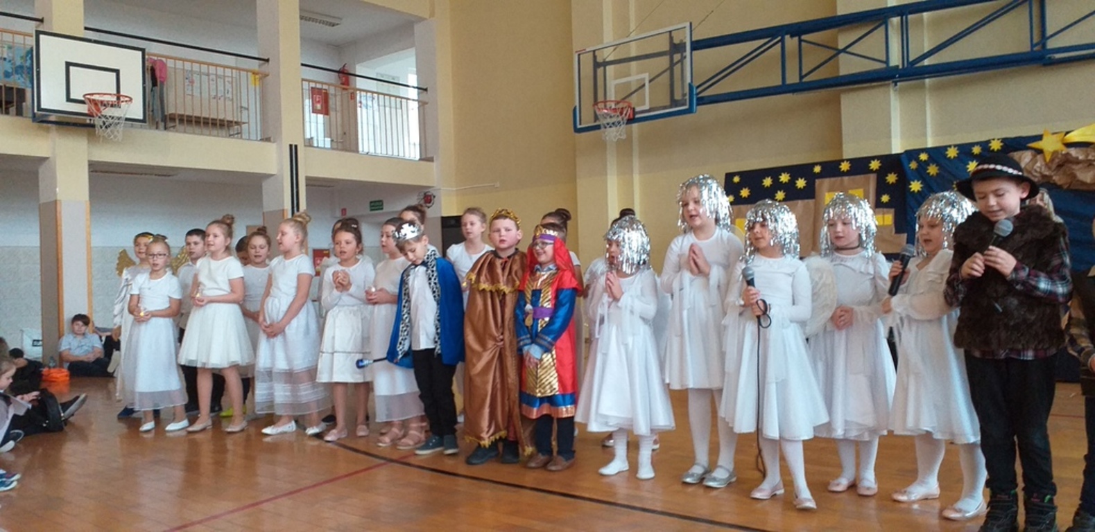Po nastrojowym tańcu śnieżynek odbyło się przedstawienie jasełkowe w wykonaniu uczniów klasy I „ Do szopy, hej pasterze”. Ta wymowna część artystyczna, gdzie pastuszek swoim dobrym postępowaniem przemienił serce rozbójnika, wprowadziła wszystkich w miły, świąteczny nastrój. Uczniowie pięknie wyśpiewali kolędy w chórze, solo a nawet migając.