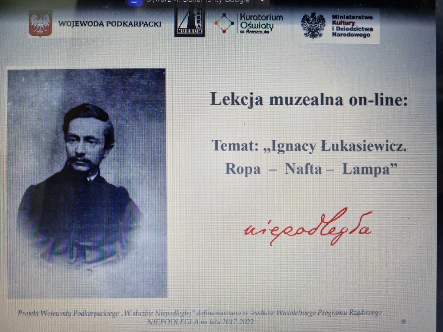 12 października uczniowie klas IV – VI naszej szkoły uczestniczyli w lekcji muzealnej on-line pt. ”Ignacy Łukasiewicz. Ropa – Nafta – Lampa” przeprowadzonej przez pracowników MPNiG w Bóbrce. Wydarzenie to upamiętnia 200. rocznicę urodzin Ignacego Łukasiewicza, który został przez Sejm Rzeczypospolitej Polskiej ustanowiony patronem roku 2022. Patronat nad inicjatywą objął Wojewoda Podkarpacki Pani Ewa Leniart oraz Kurator Oświaty Małgorzata Rauch.
