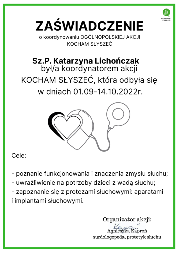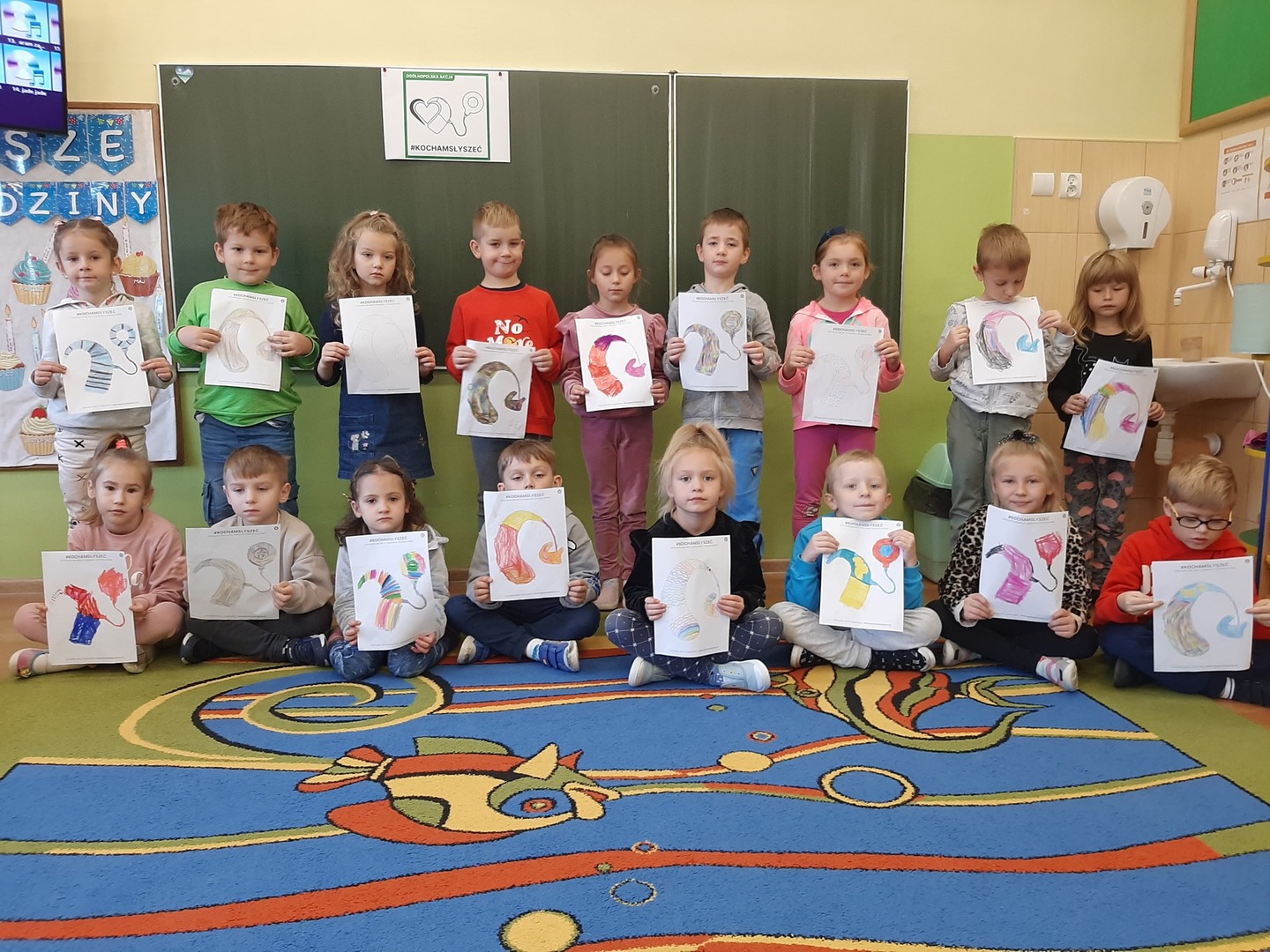 Dzieci z oddziału przedszkolnego wzięły udział w ogólnopolskiej akcji „Kocham słyszeć”. Akcja ma na celu poznanie znaczenia i funkcjonowania zmysłu słuchu, uwrażliwienie na potrzeby dzieci z wadą słuchu oraz zapoznanie z protezami słuchowymi – aparatem i implantem. W ramach akcji przedszkolaki obejrzały krótki film o budowie ucha oraz dowiedziały się, jak to się dzieje, że słyszymy. Dzieci chętnie opowiadały o tym, w jaki sposób można pomagać osobom z niedosłuchem. Pod koniec zajęć przedszkolaki ozdobiły według własnego pomysłu aparat i implant. Dzieci wykonały piękne prace plastyczne i jednogłośnie stwierdziły, że należy dbać o słuch.