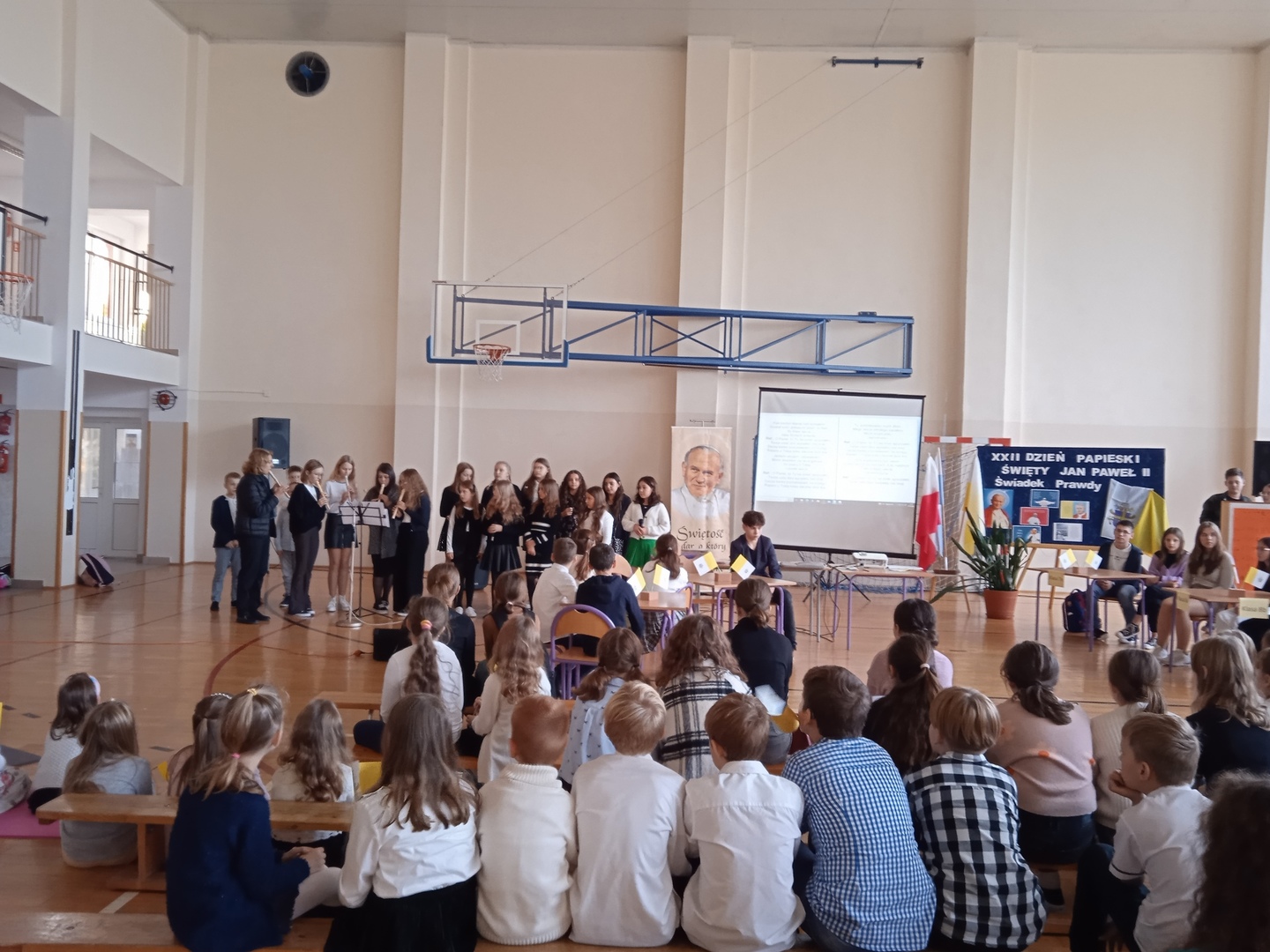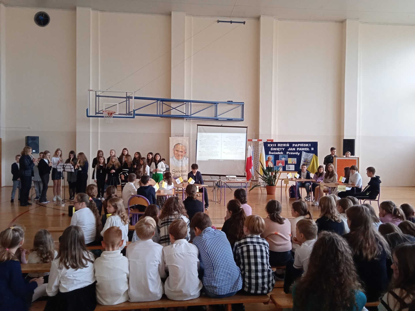 W piątek, 21 października 2022 r. społeczność naszej szkoły wraz z nauczycielami zgromadziła się na sali gimnastycznej, aby zobaczyć część artystyczną poświęconą osobie wielkiego Papieża Polaka. W tym roku spotkanie miało nietypową formę, ponieważ Ksiądz Grzegorz Łach zorganizował Quiz wiedzy o świętym Janie Pawle II. Uczniowie z klasy IV-VIII odpowiadali na pytania związane z wydarzeniami dotyczącymi życia Ojca Świętego. Na zakończenie uroczystości pani dyrektor Agnieszka Kukułka wręczyła najlepszym drużynom dyplomy i nagrody. Konkurs wygrali uczniowie klasy VIb: Kaja Bojarska i Michał Korba. Gratulujemy wszystkim uczestnikom quizu wiedzy o życiu Jana Pawła II.