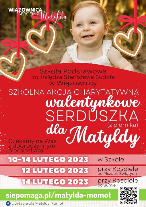 Może być zdjęciem przedstawiającym 1 osoba, dziecko i tekst „WIĄZOWNICA SERCEMZatyd atyldą SERCEMZ Szkoła Podstawowa im. Księdza Stanisława Sudoła w Wiązownicy SZKOLNA AKCJA CHARYTATYWNA walentynkowe SERDUSZKA dla Matyldy (z piernika) Czekamy na Co Was Bierhracznyamin 10-14LUTEGO 2023 w Szkole 12 2LUTEGO 2023 przy Kościele po Mszach Swiętych 14LUTEGO 2023 przy Kościele po Sumie siepomaga.pl/matyIda-momot Licytacje dla Matyldy Momot”