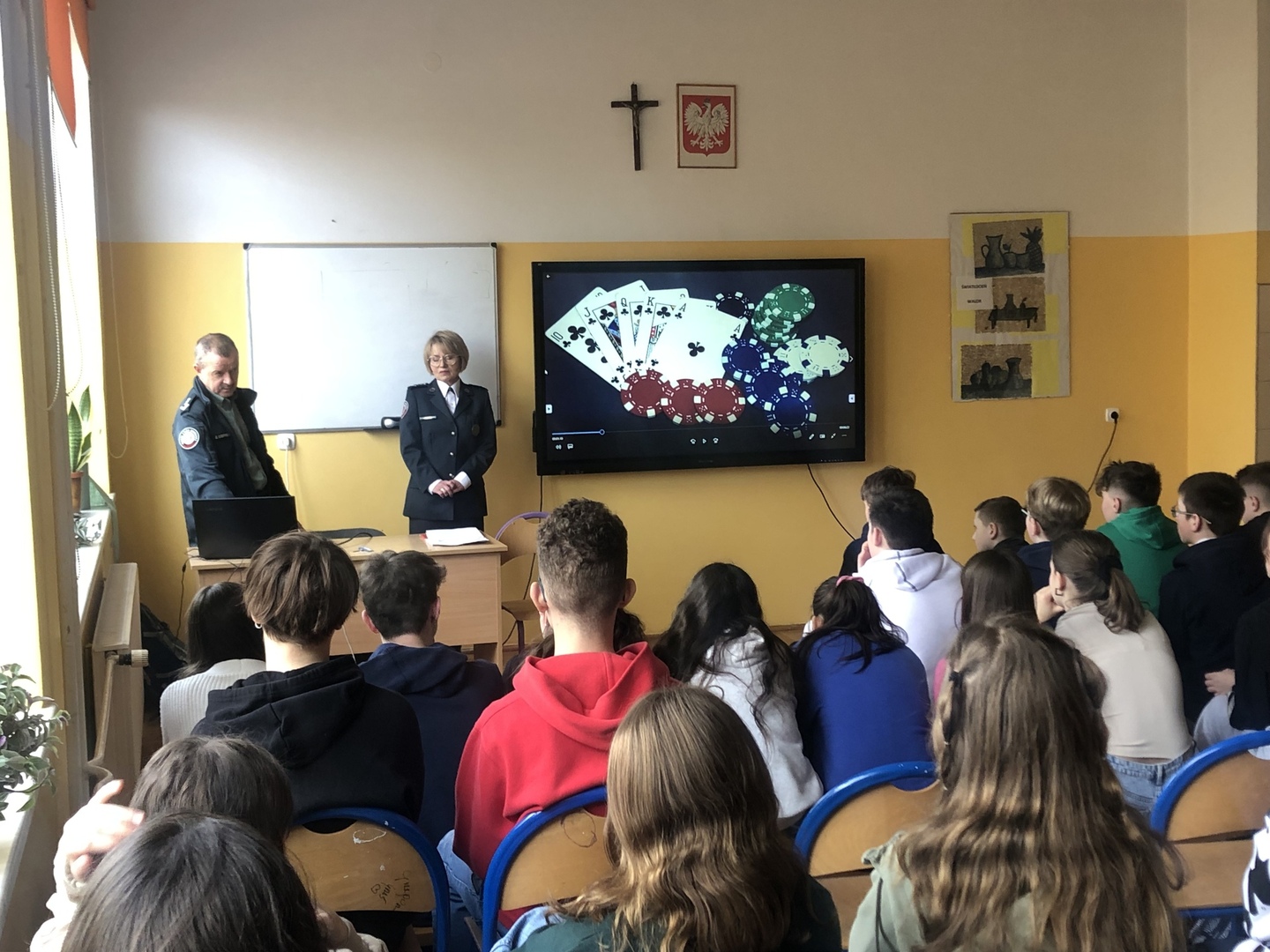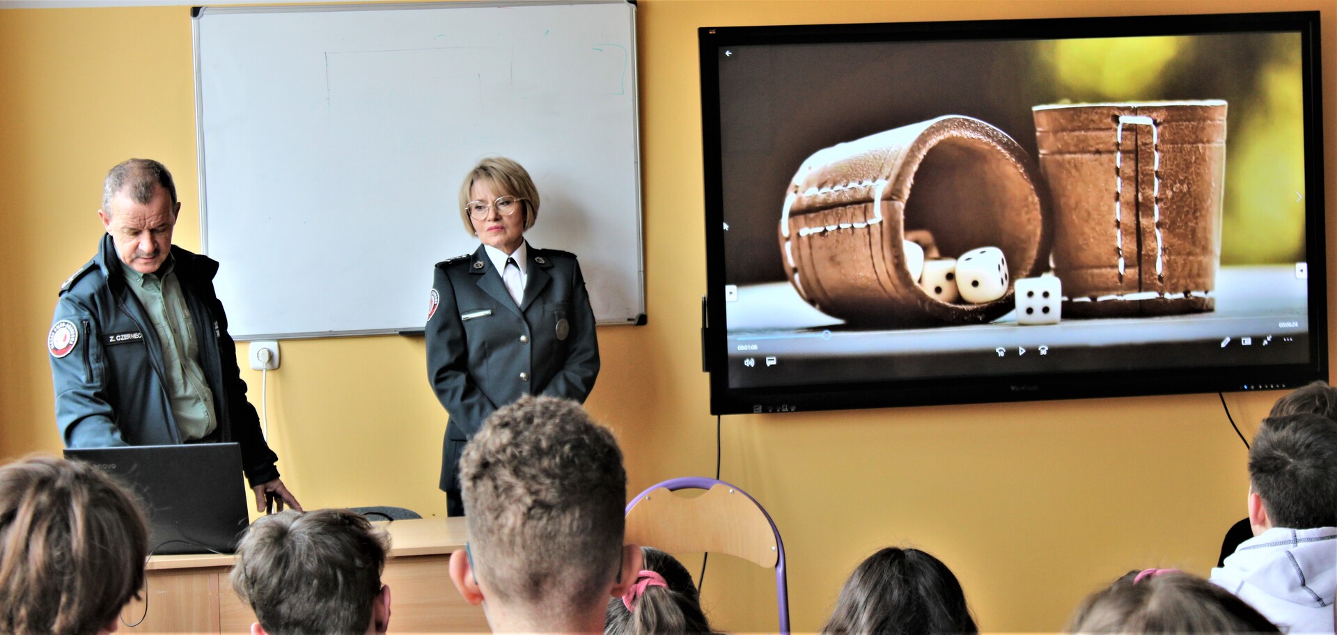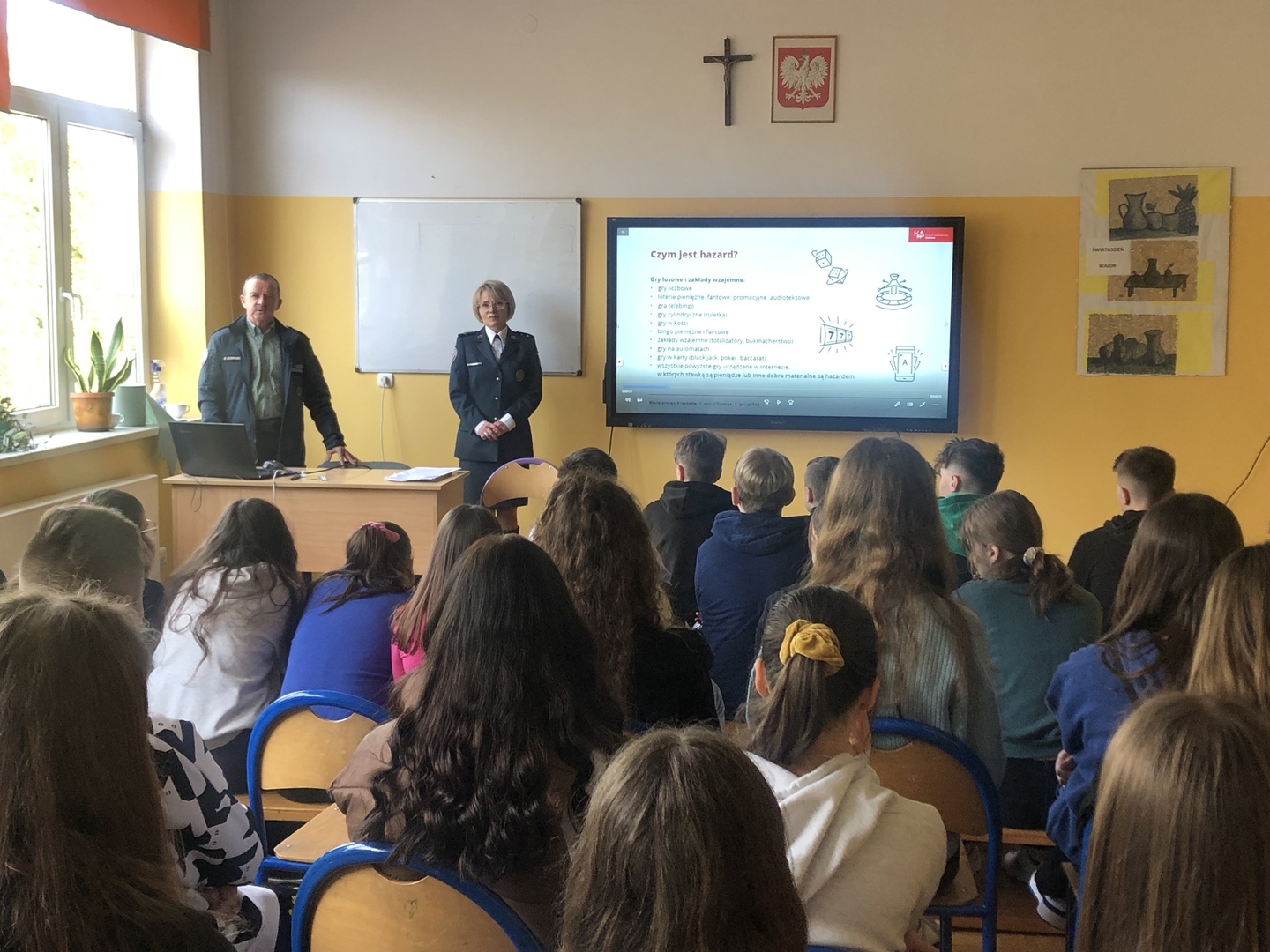 z rozpowszechnianiem wśród dzieci i młodzieży gier online z elementami hazardu oraz typowych gier hazardowych. Uczniowie dowiedzieli się o zagrożeniach wiążących się z hazardem. Funkcjonariusze zwrócili uwagę uczniów na mechanizmy uzależnienia, jakie występują w grach komputerowych oraz wskazali, gdzie można uzyskać pomoc w tym zakresie. Młodzież dowiedziała się również, jakie konsekwencje prawne wiążą się z udziałem w procederze nielegalnego urządzania i prowadzenia gier hazardowych.