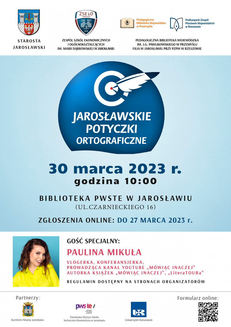 Wielkimi krokami, szykujemy się do tegorocznej edycji Jarosławskich Potyczek Ortograficznych, która odbędzie się już 30 marca 2023 r. To szczególne dla nas wydarzenie, podczas którego poznamy nowych Jarosławskich Mistrzów Ortografii. Rozpocznie się o godzinie 10:00 w Auli Biblioteki Państwowej Wyższej Szkoły Techniczno-Ekonomicznej w Jarosławiu przy ul. Czarnieckiego 16. Przed uczestnikami konkursu kolejne zmagania i pułapki naszego języka ojczystego.