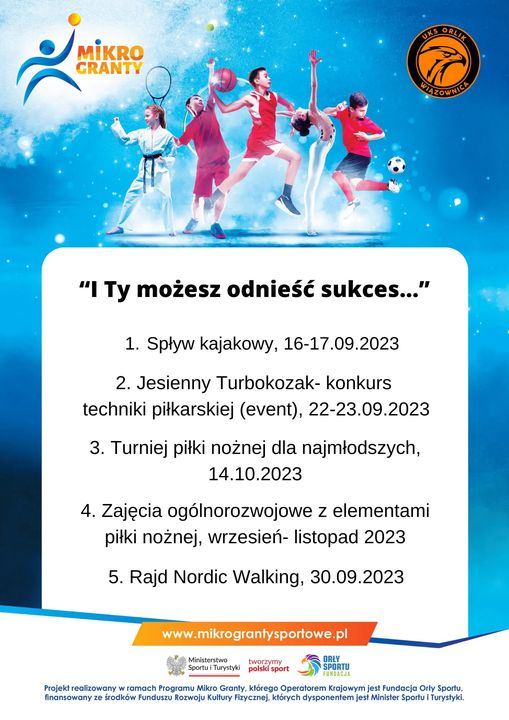 Miło nam poinformować, że nasz klub Uczniowski Klub Sportowy ORLIK Wiązownica otrzymał dofinansowanie ze środków Funduszu Rozwoju Kultury Fizycznej, których dysponentem jest Ministerstwo Sportu i Turystyki na realizację projektu pod nazwą : „I Ty możesz odnieść sukces…” w ramach Mikro Granty .