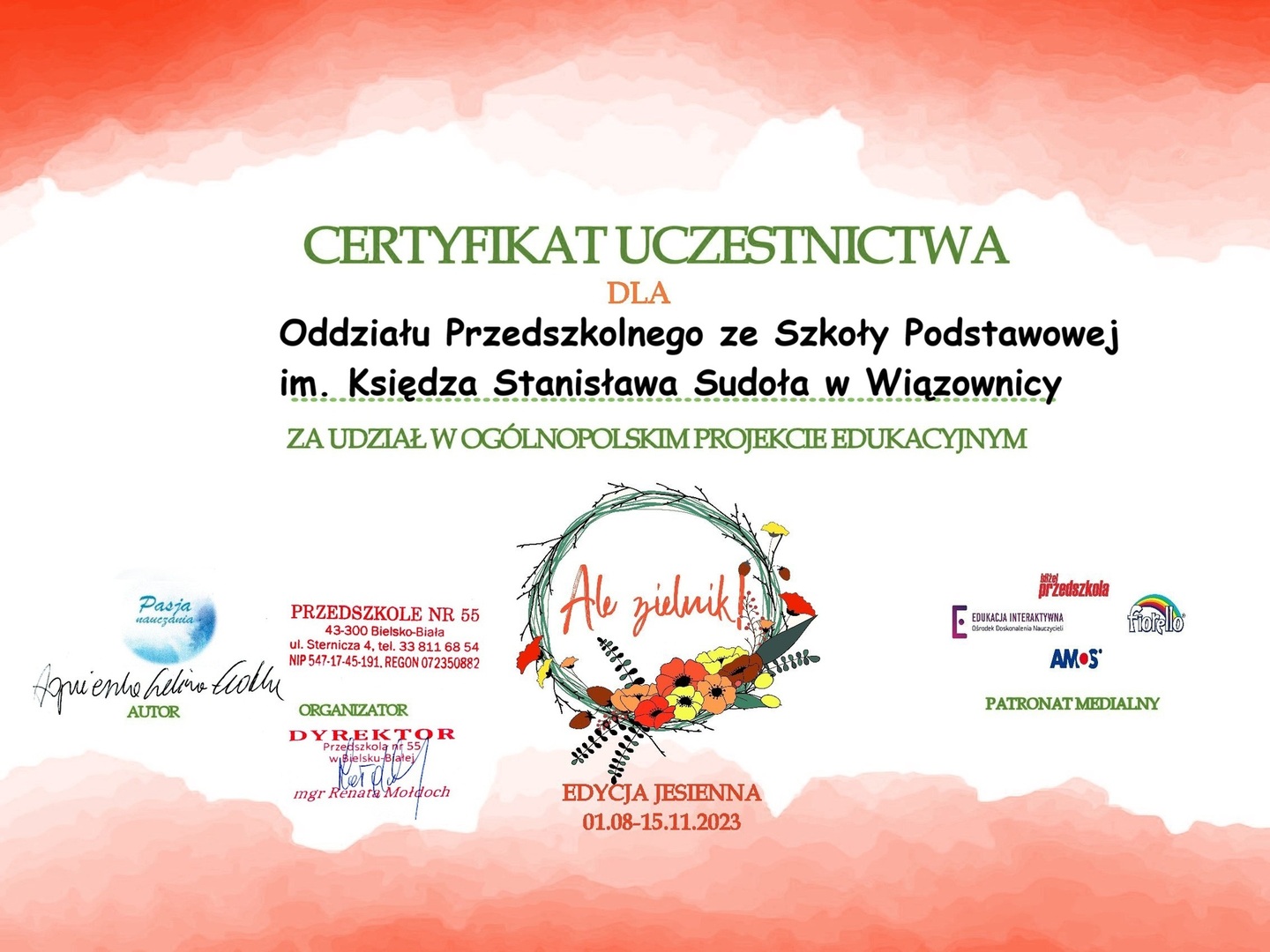 Dzieci z oddziału przedszkolnego z grupy 0a wzięły udział w jesiennej edycji projektu edukacyjnego pt.” Ale zielnik”. Wszyscy z wielkim zaangażowaniem wykonywali zaproponowane zadania, które pozwoliły rozwinąć zainteresowania dzieci światem przyrody oraz poszerzyć ich wiedzę z zakresu botaniki.