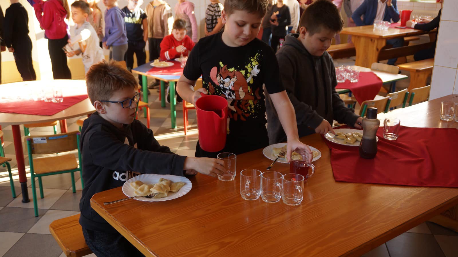 Z wielką radością informujemy, że w piątek, 12 stycznia rozpoczęła działalność nasza nowa szkolna kuchnia. Oficjalnego otwarcia dokonali: wójt gminy Pan Krzysztof Strent, sekretarz gminy Pan Artur Zołyniak, skarbnik gminy Pan Witold Dorosz oraz dyrektor szkoły Agnieszka Kukułka. Po symbolicznym przecięciu wstęgi goście oraz uczniowie degustowali serwowane w pierwszym dniu przepyszne pierogi i pachnący kompot. Niewątpliwą atrakcją była zapowiedziana i oczekiwana przez uczniów niespodzianka.