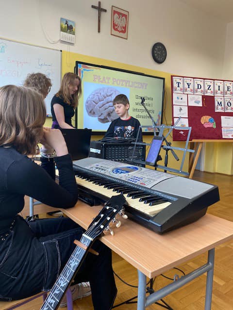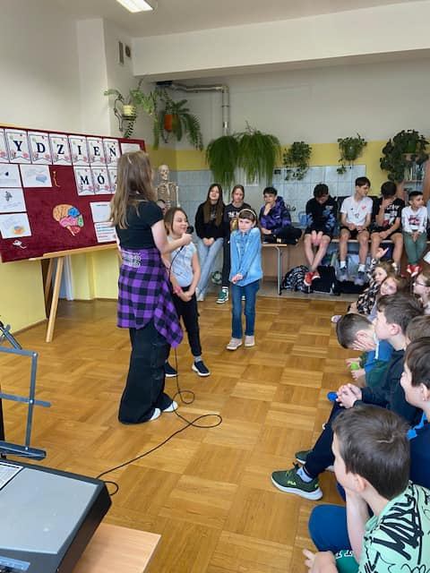 20 III 2024 r. uczniowie klasy VII a w ramach obchodów Europejskiego Dnia Mózgu i Światowego Tygodnia Mózgu zaprezentowali młodszym kolegom z klas I- III program dotyczący tego organu. Do realizacji projektu wykorzystane zostały: gazetki, prezentacja multimedialna i modele ludzkiego mózgu. Przedstawiono również działania rozwijające jego pracę poprzez grę na instrumentach muzycznych i żonglowanie piłką nożną. Uczennice zaprezentowały również skuteczne metody uczenia się. Wiele emocji wzbudziło wspólne śpiewanie piosenki „W Układzie Słonecznym" oraz zorganizowane zabawy i zagadki dotyczące mózgu. Następnie uczennice: Amelka, Ania, Nikola i Karolina złożyły wizytę w poszczególnych klasach, gdzie zaprezentowały ćwiczenia zręcznościowe służące rozwijaniu pamięci. Były to zagadki oraz informacje związane z technikami szybkiego zapamiętywania, uczenia się i planowania nauki. Organizatorki wykazały dobrą organizacją i pomysłowością w realizacji tematu. Gratulujemy inicjatywy!