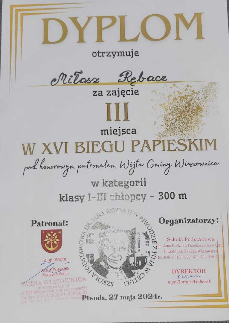 Z wielką radością informujemy, że Miłosz Rębacz uczeń lasy II b zajął III miejsce w kategorii klas I -III w XVI Biegu Papieskim, który odbył się w dniu dzisiejszym w Piwodzie. Gratulujemy i życzymy dlaszych sportowych sukcesów!