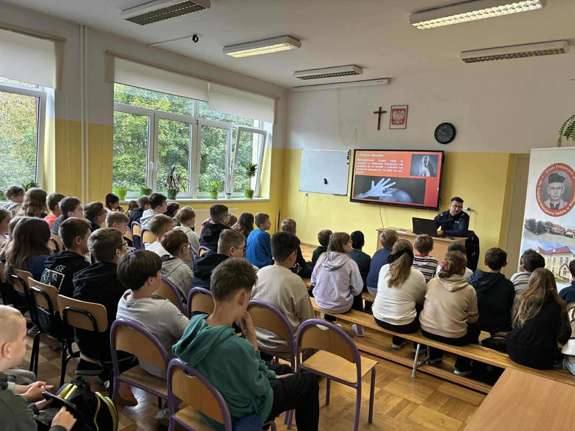 W spotkaniach zorganizowanych w dwóch grupach uczestniczyli uczniowie klas IV–VIII. Pan Dzielnicowy poruszył bardzo ważny temat przemocy – omówił jej różne formy oraz skutki prawne zarówno dla osób niepełnoletnich, jak i pełnoletnich.