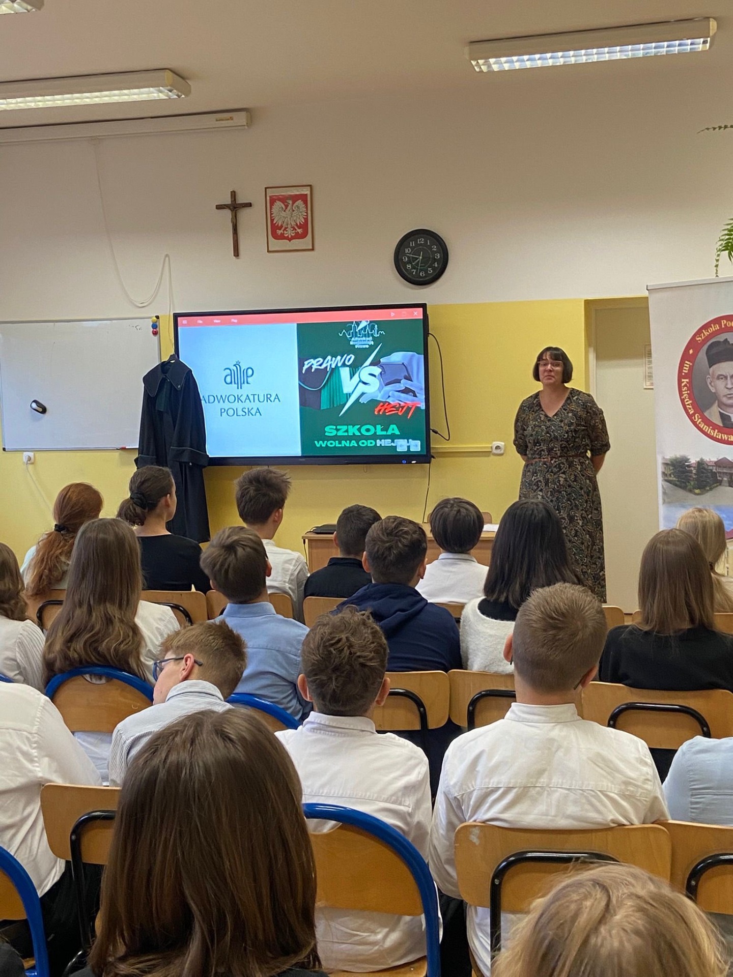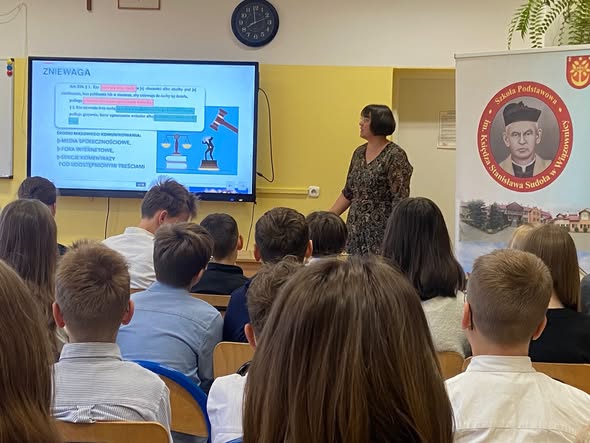 7 listopada uczniowie klas VI wzięli udział w niezwykle wartościowych zajęciach z panią adwokat Marzeną Szklarz-Stępień, zorganizowanych w ramach IV edycji ogólnopolskiej akcji „Adwokaci rozjaśniają prawo”. Tegoroczne hasło przewodnie brzmi: „Prawo vs. Hejt. Szkoła wolna od hejtu”.