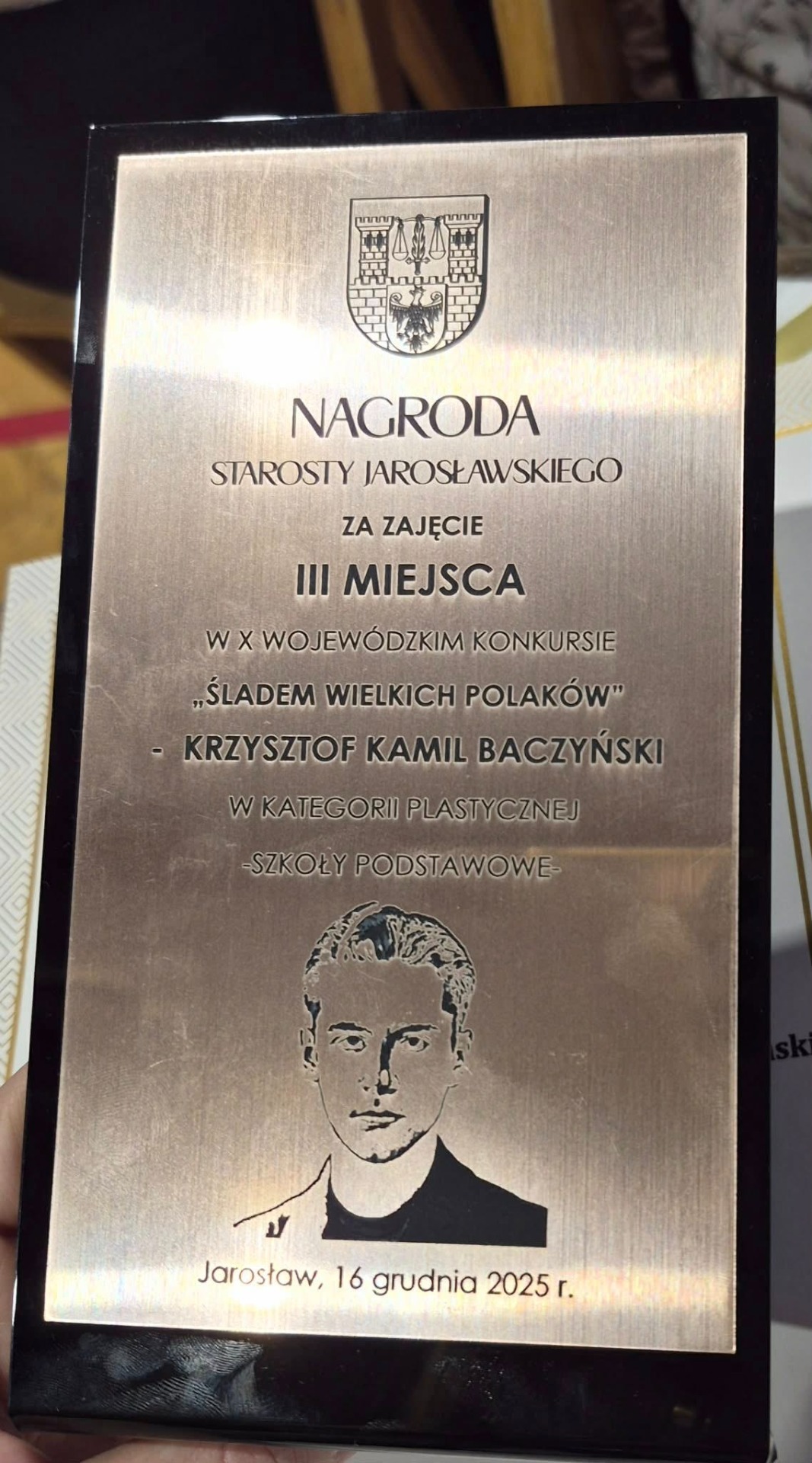 Z wielką radością przyjęliśmy wiadomość o sukcesach naszych uczennic w X edycji organizowanego przez jarosławski ZSBiO wojewódzkiego konkursu „Śladem wielkich Polaków”, który w tym roku został poświęcony Krzysztofowi Kamilowi Baczyńskiemu. W kategorii plastycznej III miejsce zajęła Amelia Fok (kl VIIIB) za ilustrację do wiersza „Historia”, zaś praca Julki Stryczek z klasy VIA zdobyła wyróżnienie. Także wyróżnienie w kategorii wiedzy o życiu i twórczości poety otrzymała siódmoklasistka Zuzanna Powroźnik. Nagrodzonym uczennicom gratulujemy i życzymy kolejnych osiągnięć!
